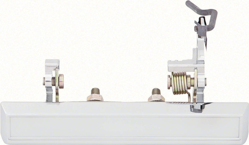 Reproduction of the original outer chrome door handle for the passenger side. This complete assembly includes the chrome handle (6-1/4" long), the spring mechanism and gasket (escutcheon).