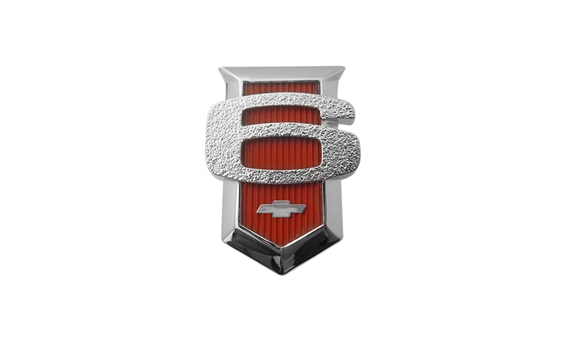 Be proud of that 6 cylinder. There are not that many left! Trim Parts is proud to offer the 6 cylinder front fender shield. Die cast and chrome plated then painted in red. Includes fasteners. Original GM part # 3827151.